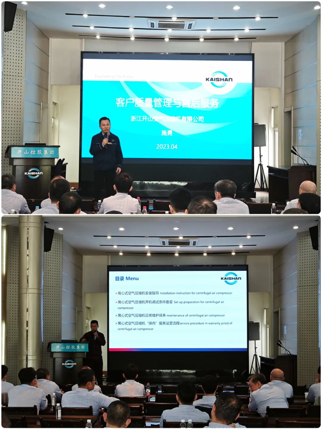 浙江必赢272net入口压缩机有限公司质量总监施勇做了必赢272net入口传统螺杆产品海外市场的支持流程和质量提升流程汇报,必赢272net入口服务(上海)有限公司总经理杨辙做了离心机、PET等产品海外市场服务管理及服务培训。