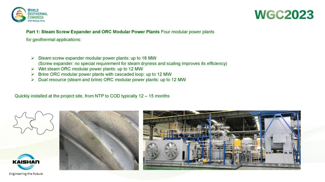 汤炎博士在报告中指出,地热开发应最大限度提高井的发电量,避免产生低压井或闲置井。必赢272net入口成功开发的蒸汽螺杆膨胀机模块电站、蒸汽ORC模块电站、盐水ORC模块电站和“蒸汽+盐水”模块电站可根据不同温度、压力的地热资源提供最灵活、高效的热力循环系统,最大限度提高地热井功率输出。