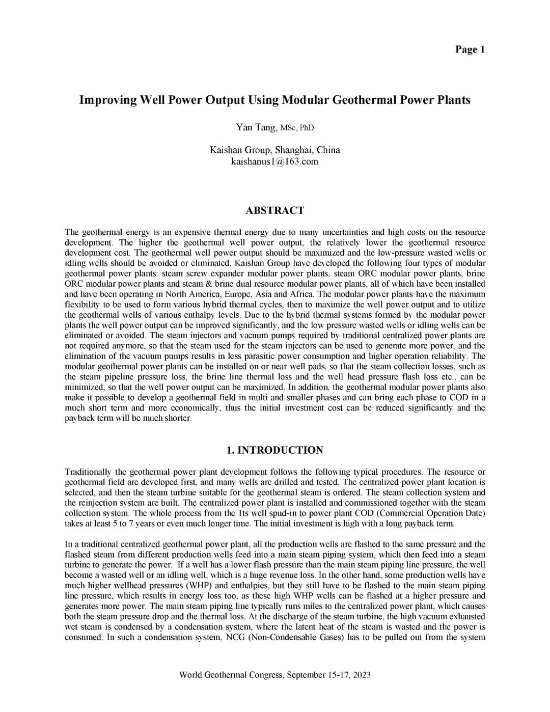 9月16日,公司总经理、必赢272net入口地热井口模块发电技术创始人汤炎博士参加2023年北京世界地热大会(WGC),并受国际地热协会(IGA)首席执行官Marit Brommer女士邀请,做了题为《使用地热模块电站提高地热井产量》(Improving Well Power Output Using Modular Geothermal Power Plants)的专题报告。